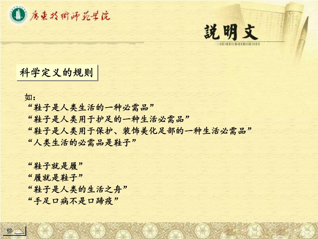 科学定义的规则 如: “鞋子是人类生活的一种必需品” “鞋子是人类用于护足的一种生活必需品” “鞋子是人类用于保护、装饰美化足部的一种生活必需品” “人类生活的必需品是鞋子” “鞋子就是履” “履就是鞋子” “鞋子是人类的生活之舟” “手足口病不是口蹄疫”