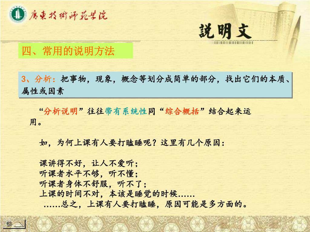 四、常用的说明方法 3、分析:把事物,现象,概念等划分成简单的部分,找出它们的本质、属性或因素 “分析说明”往往带有系统性同“综合概括”结合起来运用。 如,为何上课有人要打瞌睡呢?这里有几个原因: 课讲得不好,让人不爱听; 听课者水平不够,听不懂; 听课者身体不舒服,听不了; 上课的时间不对,本该是睡觉的时候…… ……总之,上课有人要打瞌睡,原因可能是多方面的。