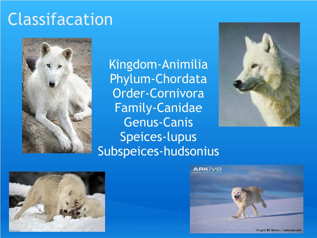 Classifacation Kingdom-Animilia Phylum-Chordata Order-Cornivora Family-Canidae Genus-Canis Speices-lupus Subspeices-hudsonius