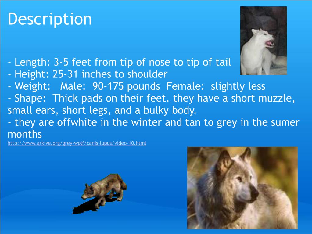 Description - Length: 3-5 feet from tip of nose to tip of tail - Height: 25-31 inches to shoulder - Weight: Male: 90-175 pounds Female: slightly less - Shape: Thick pads on their feet. they have a short muzzle, small ears, short legs, and a bulky body. - they are offwhite in the winter and tan to grey in the sumer months http://www.arkive.org/grey-wolf/canis-lupus/video-10.html