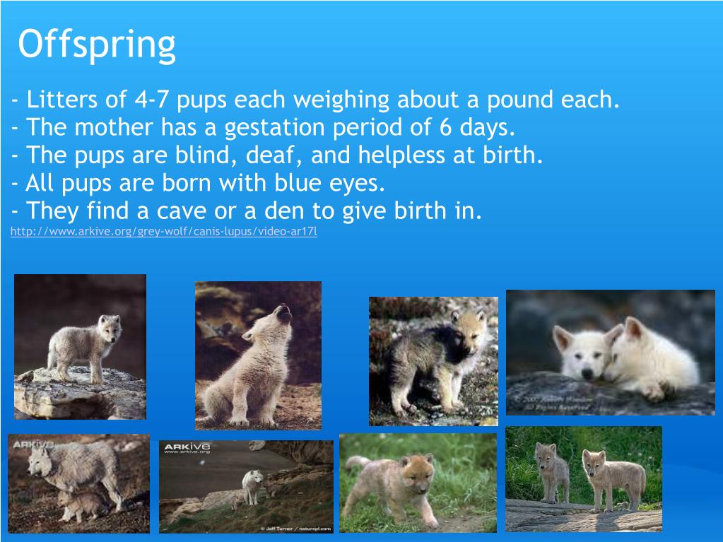 Offspring - Litters of 4-7 pups each weighing about a pound each. - The mother has a gestation period of 6 days. - The pups are blind, deaf, and helpless at birth. - All pups are born with blue eyes. - They find a cave or a den to give birth in. http://www.arkive.org/grey-wolf/canis-lupus/video-ar17l