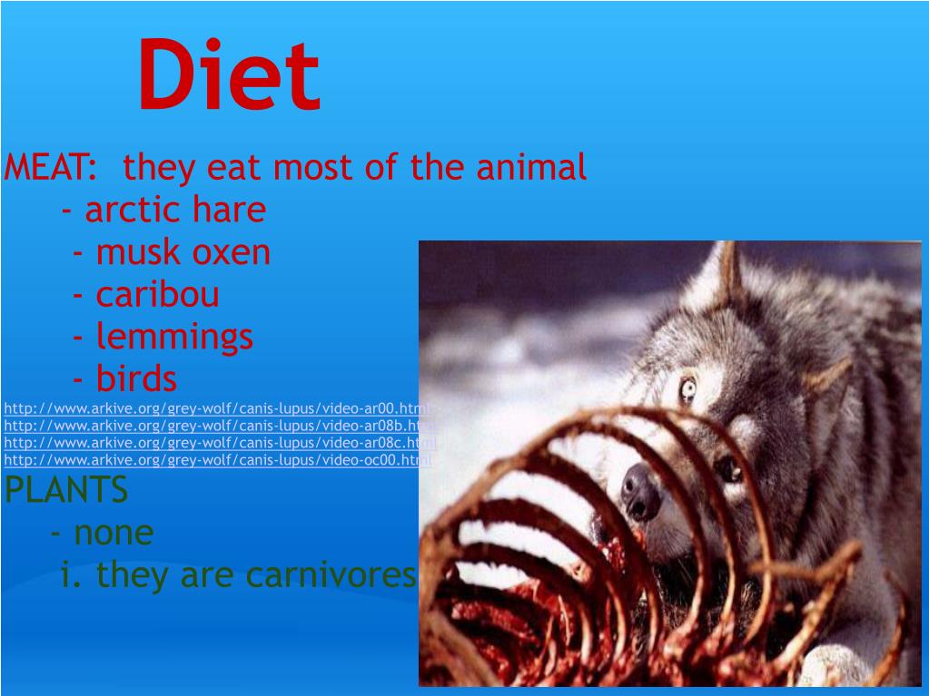 Diet MEAT: they eat most of the animal - arctic hare - musk oxen - caribou - lemmings - birds http://www.arkive.org/grey-wolf/canis-lupus/video-ar00.html http://www.arkive.org/grey-wolf/canis-lupus/video-ar08b.html http://www.arkive.org/grey-wolf/canis-lupus/video-ar08c.html http://www.arkive.org/grey-wolf/canis-lupus/video-oc00.html PLANTS - none i. they are carnivores