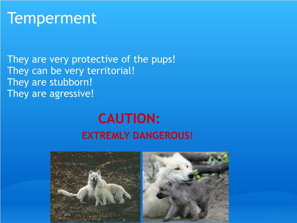 Temperment They are very protective of the pups! They can be very territorial! They are stubborn! They are agressive! CAUTION: EXTREMLY DANGEROUS!