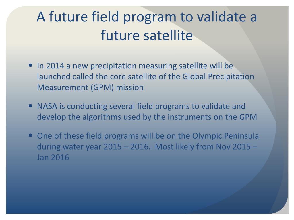 A future field program to validate a future satellite • In2014 a new precipitation measuring satellite will be launched called the core satellite of the Global Precipitation Measurement (GPM) mission • NASA is conducting several field programs to validate and develop the algorithms used by the instruments on the GPM • One of these field programs will be on the Olympic Peninsula during water year 2015 – 2016. Most likely from Nov 2015 – Jan 2016