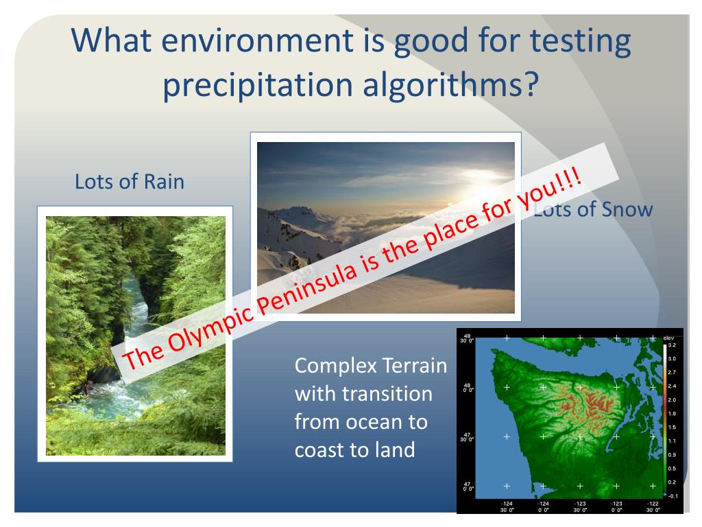 What environment is good for testing precipitation algorithms? Lots of Rain Lots of Snow The Olympic Peninsula is the place for you!!! Complex Terrain with transition from ocean to coast to land