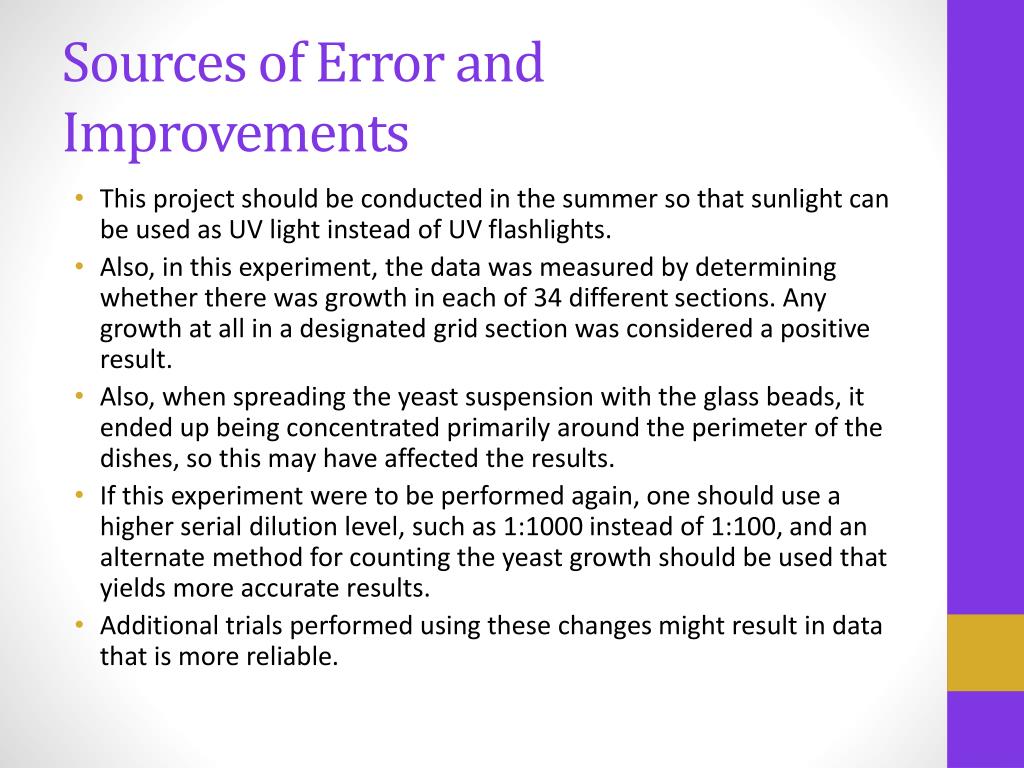 Sources of Error and Improvements • This project should be conducted in the summer so that sunlight can be used as UV light instead of UV flashlights. • Also, in this experiment, the data was measured by determining whether there was growth in each of 34 different sections. Any growth at all in a designated grid section was considered a positive result. • Also, when spreading the yeast suspension with the glass beads, it ended up being concentrated primarily around the perimeter of the dishes, so this may have affected the results. • If this experiment were to be performed again, one should use a higher serial dilution level, such as 1:1000 instead of 1:100, and an alternate method for counting the yeast growth should be used that yields more accurate results. • Additional trials performed using these changes might result in data that is more reliable.