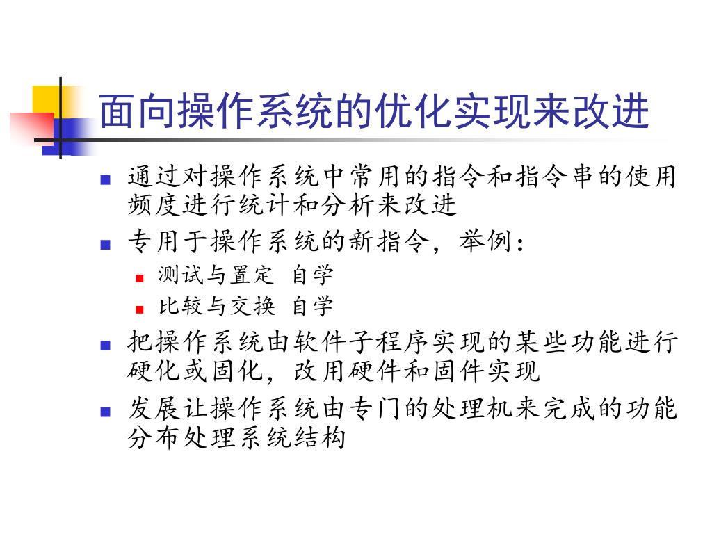 面向操作系统的优化实现来改进 • 通过对操作系统中常用的指令和指令串的使用频度进行统计和分析来改进 • 专用于操作系统的新指令,举例: • 测试与置定 自学 • 比较与交换 自学 • 把操作系统由软件子程序实现的某些功能进行硬化或固化,改用硬件和固件实现 • 发展让操作系统由专门的处理机来完成的功能分布处理系统结构