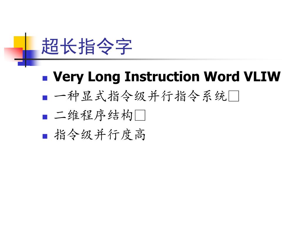 超长指令字 • Very Long Instruction Word VLIW • 一种显式指令级并行指令系统 • 二维程序结构 • 指令级并行度高