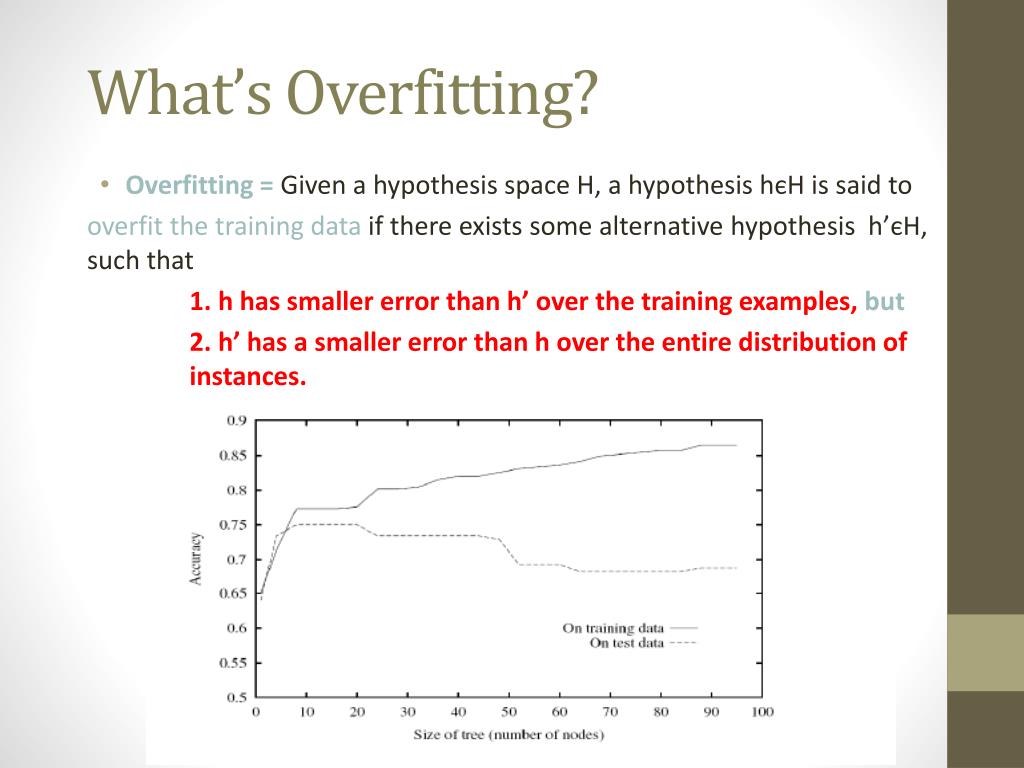 What’s Overfitting? • Overfitting =Given a hypothesis space H, a hypothesis hєH is said to overfitthe training data if there exists some alternative hypothesis h’єH, such that 1. h has smaller error than h’ over the training examples, but 2. h’ has a smaller error than h over the entire distribution of instances.