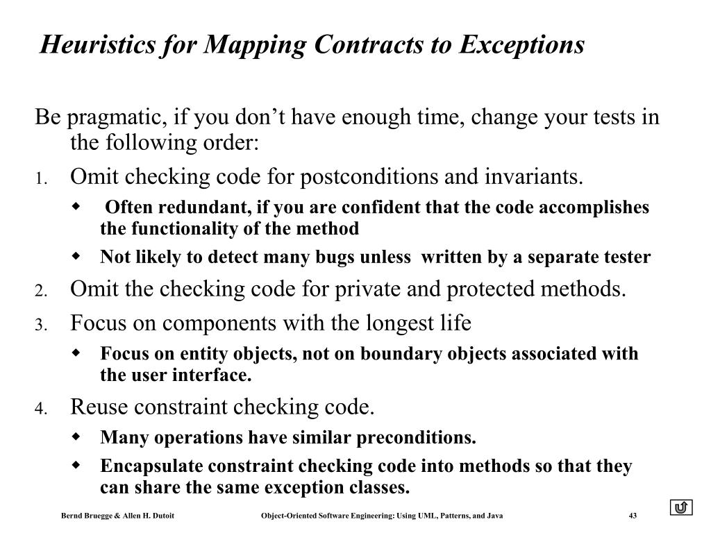 Heuristics for Mapping Contracts to Exceptions Be pragmatic, if you don’t have enough time, change your tests in the following order: • Omit checking code for postconditions and invariants. • Often redundant, if you are confident that the code accomplishes the functionality of the method • Not likely to detect many bugs unless written by a separate tester • Omit the checking code for private and protected methods. • Focus on components with the longest life • Focus on entity objects, not on boundary objects associated with the user interface. • Reuse constraint checking code. • Many operations have similar preconditions. • Encapsulate constraint checking code into methods so that they can share the same exception classes.