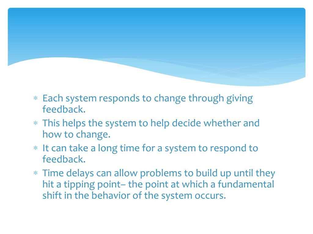 Each system responds to change through giving feedback. This helps the system to help decide whether and how to change. It can take a long time for a system to respond to feedback. Time delays can allow problems to build up until they hit a tipping point– the point at which a fundamental shift in the behavior of the system occurs.