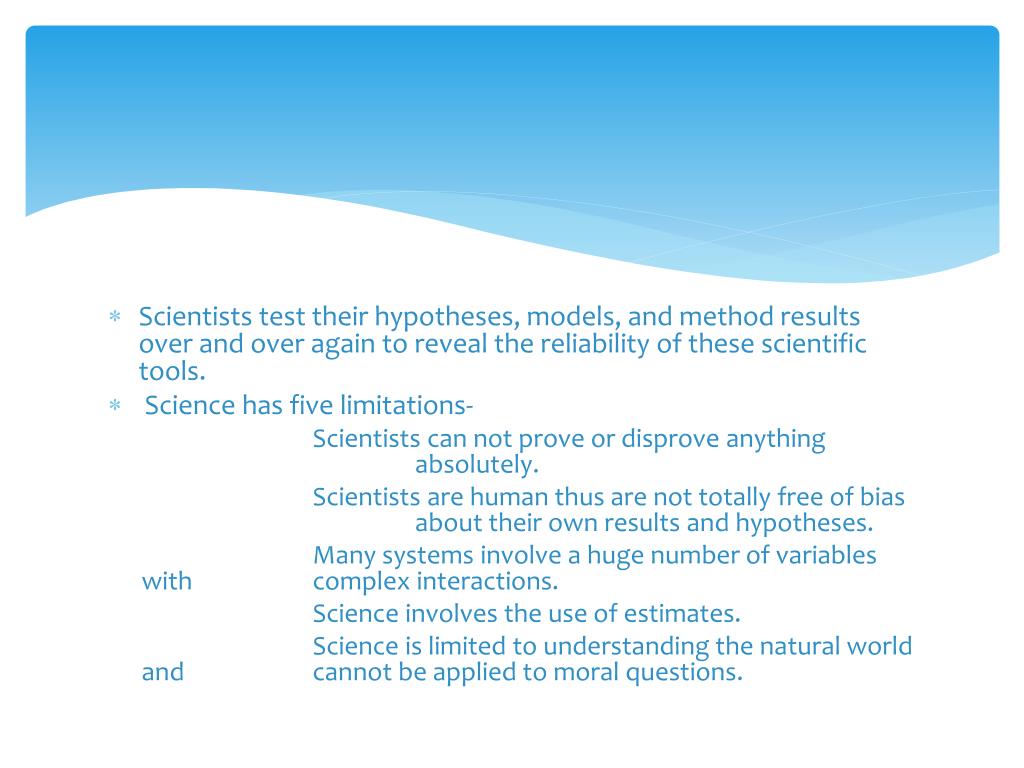 Scientists test their hypotheses, models, and method results over and over again to reveal the reliability of these scientific tools. • Science has five limitations- Scientists can not prove or disprove anything absolutely. Scientists are human thus are not totally free of bias about their own results and hypotheses. Many systems involve a huge number of variables with complex interactions. Science involves the use of estimates. Science is limited to understanding the natural world and cannot be applied to moral questions.
