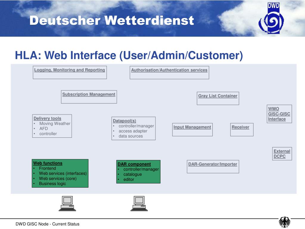 Web functions • Frontend • Web services (interfaces) • Web services (core) • Business logic • DAR component • controller/manager • catalogue • editor HLA: Web Interface (User/Admin/Customer) Logging, Monitoring and Reporting Authorisation/Authentication services SubscriptionManagement Gray List Container WMO GISC-GISC Interface • Delivery tools • Moving Weather • AFD • controller • Datapool(s) • controller/manager • access adapter • data sources Input Management Receiver External DCPC DAR-Generator/Importer