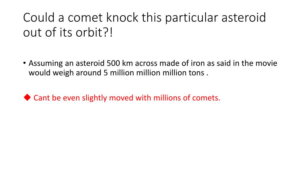 Could a comet knock this particular asteroid out of its orbit?! • Assuming an asteroid 500 km across made of iron as said in the movie would weigh around 5 million million million tons . • Cant be even slightly moved with millions of comets.