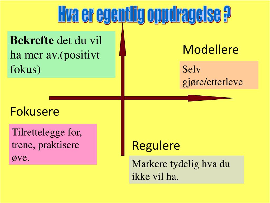 Hva er egentlig oppdragelse ? Bekreftedet du vil ha mer av.(positivtfokus) Modellere Selv gjøre/etterleve Fokusere Tilrettelegge for, trene, praktisereøve. Regulere Markeretydelighva du ikkevil ha.