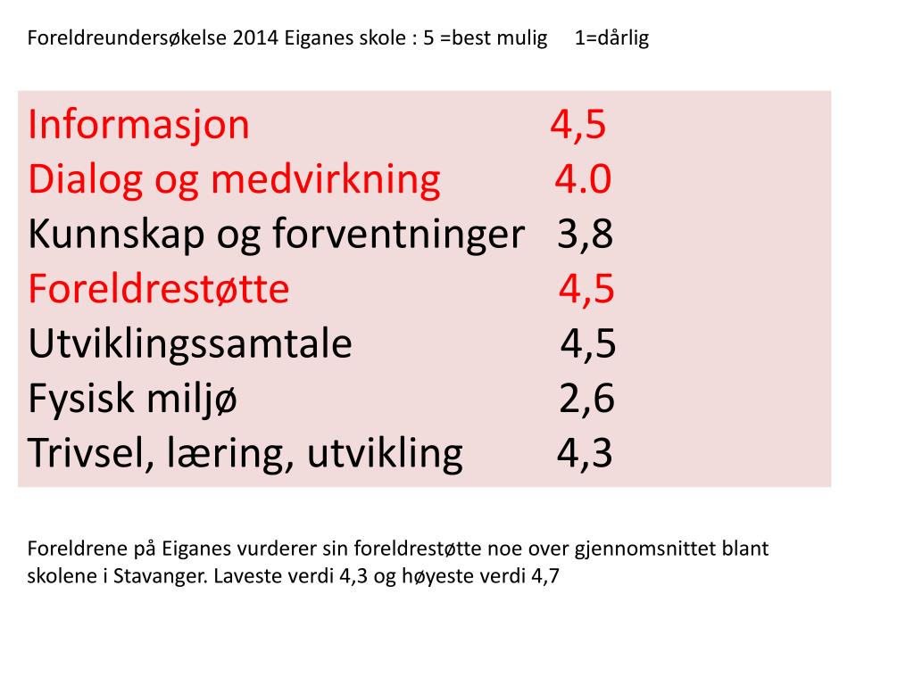 Foreldreundersøkelse 2014 Eiganes skole : 5 =best mulig 1=dårlig Informasjon 4,5 Dialog og medvirkning 4.0 Kunnskap og forventninger 3,8 Foreldrestøtte 4,5 Utviklingssamtale 4,5 Fysisk miljø 2,6 Trivsel, læring, utvikling 4,3 Foreldrene på Eiganes vurderer sin foreldrestøtte noe over gjennomsnittet blant skolene i Stavanger. Laveste verdi 4,3 og høyeste verdi 4,7