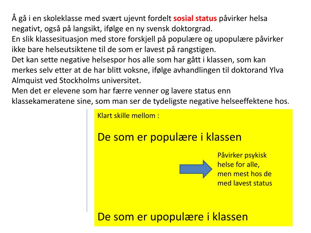 Å gå i en skoleklasse med svært ujevnt fordelt sosial status påvirker helsa negativt, også på langsikt, ifølge en ny svensk doktorgrad. En slik klassesituasjon med store forskjell på populære og upopulære påvirker ikke bare helseutsiktene til de som er lavest på rangstigen. Det kan sette negative helsespor hos alle som har gått i klassen, som kan merkes selv etter at de har blitt voksne, ifølge avhandlingen til doktorand Ylva Almquist ved Stockholms universitet. Men det er elevene som har færre venner og lavere status enn klassekameratene sine, som man ser de tydeligste negative helseeffektene hos. Klart skille mellom : De som er populære i klassen De som er upopulære i klassen Påvirker psykisk helse for alle, men mest hos de med lavest status