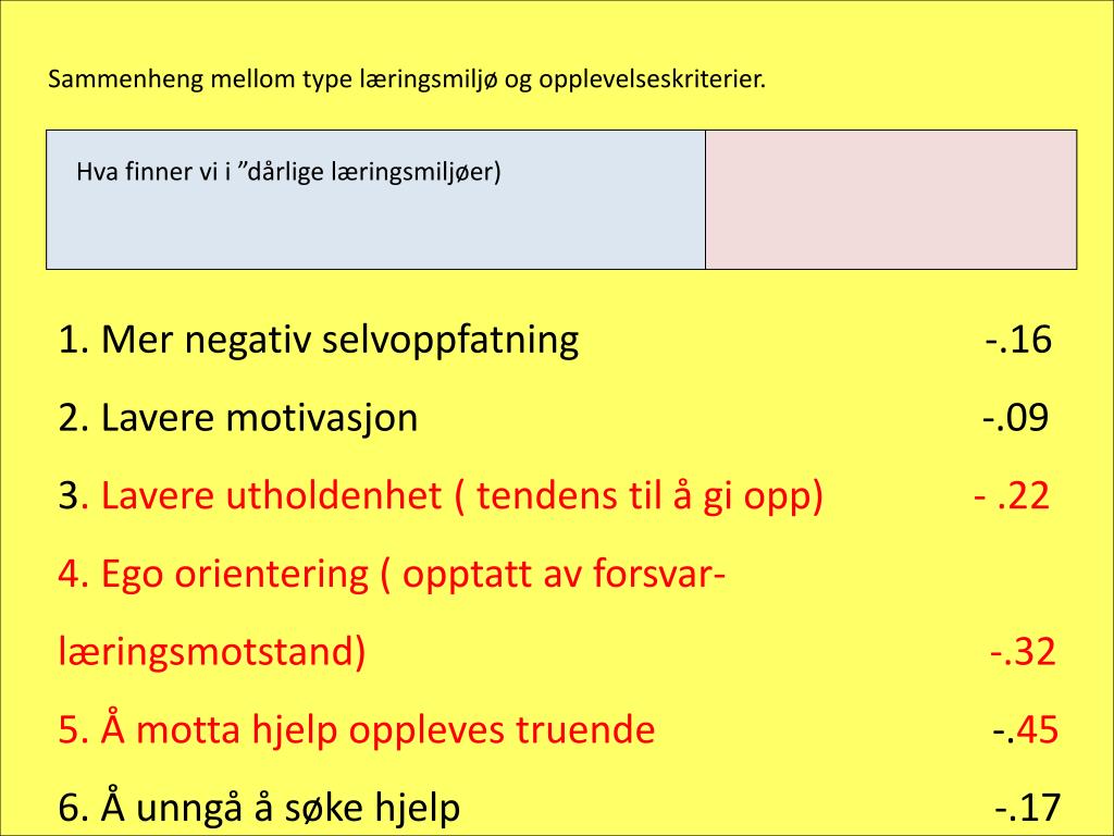 Sammenheng mellom type læringsmiljø og opplevelseskriterier. Hva finner vi i ”dårlige læringsmiljøer) 1. Mer negativ selvoppfatning -.16 2. Lavere motivasjon -.09 3. Lavere utholdenhet ( tendens til å gi opp) - .22 4. Ego orientering ( opptatt av forsvar- læringsmotstand) -.32 5. Å motta hjelp oppleves truende -.45 6. Å unngå å søke hjelp -.17