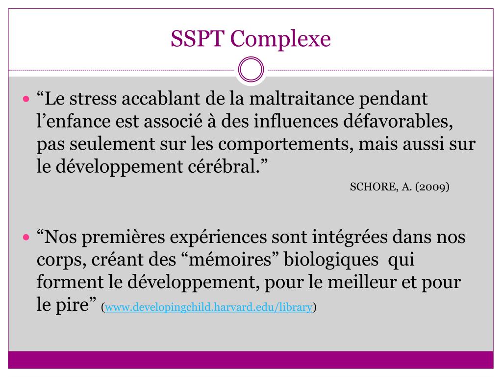 SSPT Complexe • “Le stress accablant de la maltraitance pendant l’enfanceestassociéà des influences défavorables, pas seulementsur les comportements, maisaussisur le développementcérébral.” Schore, A. (2009) • “Nos premières expériencessontintégréesdansnos corps, créant des “mémoires” biologiques qui forment le développement, pour le meilleur et pour le pire” (www.developingchild.harvard.edu/library)