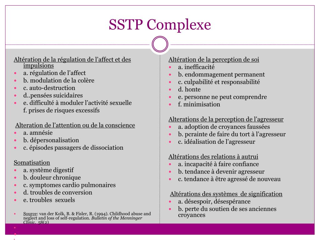 SSTP Complexe Altération de la régulation de l’affect et des impulsions a. régulation de l’affect b. modulation de la colère c. auto-destruction d..penséessuicidaires e. difficultéàmodulerl’activitésexuelle f. prises de risquesexcessifs Alteration de l’attentionou de la conscience a. amnésie b. dépersonalisation c. épisodespassagers de dissociation Somatisation a. systèmedigestif b. douleurchronique c. symptomes cardio pulmonaires d. troubles de conversion e. troubles sexuels Source: van derKolk, B. & Fisler, R. (1994). Childhood abuse and neglect and loss of self-regulation. Bulletin of the Menninger Clinic. 58(2) Altération de la perception de soi a. inefficacité b. endommagement permanent c. culpabilité et responsabilité d. honte e. personne ne peutcomprendre f. minimisation Alterations de la perception de l’agresseur a. adoption de croyancesfaussées b. pcrainte de faire du tort àl’agresseur c. idéalisation de l’agresseur Altérations des relations àautrui a. incapacitéà faire confiance b. tendanceàdeveniragresseur c. tendanceàêtreagressé de nouveau Altérations des systèmes de signification a. désespoir, désespérance b. perte du soutien de sesanciennescroyances