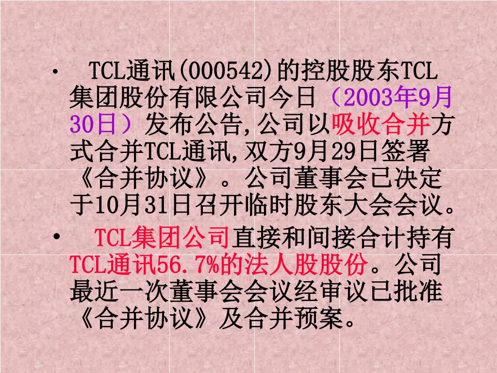 TCL通讯(000542)的控股股东TCL集团股份有限公司今日(2003年9月30日)发布公告,公司以吸收合并方式合并TCL通讯,双方9月29日签署《合并协议》。公司董事会已决定于10月31日召开临时股东大会会议。TCL通讯(000542)的控股股东TCL集团股份有限公司今日(2003年9月30日)发布公告,公司以吸收合并方式合并TCL通讯,双方9月29日签署《合并协议》。公司董事会已决定于10月31日召开临时股东大会会议。 • TCL集团公司直接和间接合计持有TCL通讯56.7%的法人股股份。公司最近一次董事会会议经审议已批准《合并协议》及合并预案。