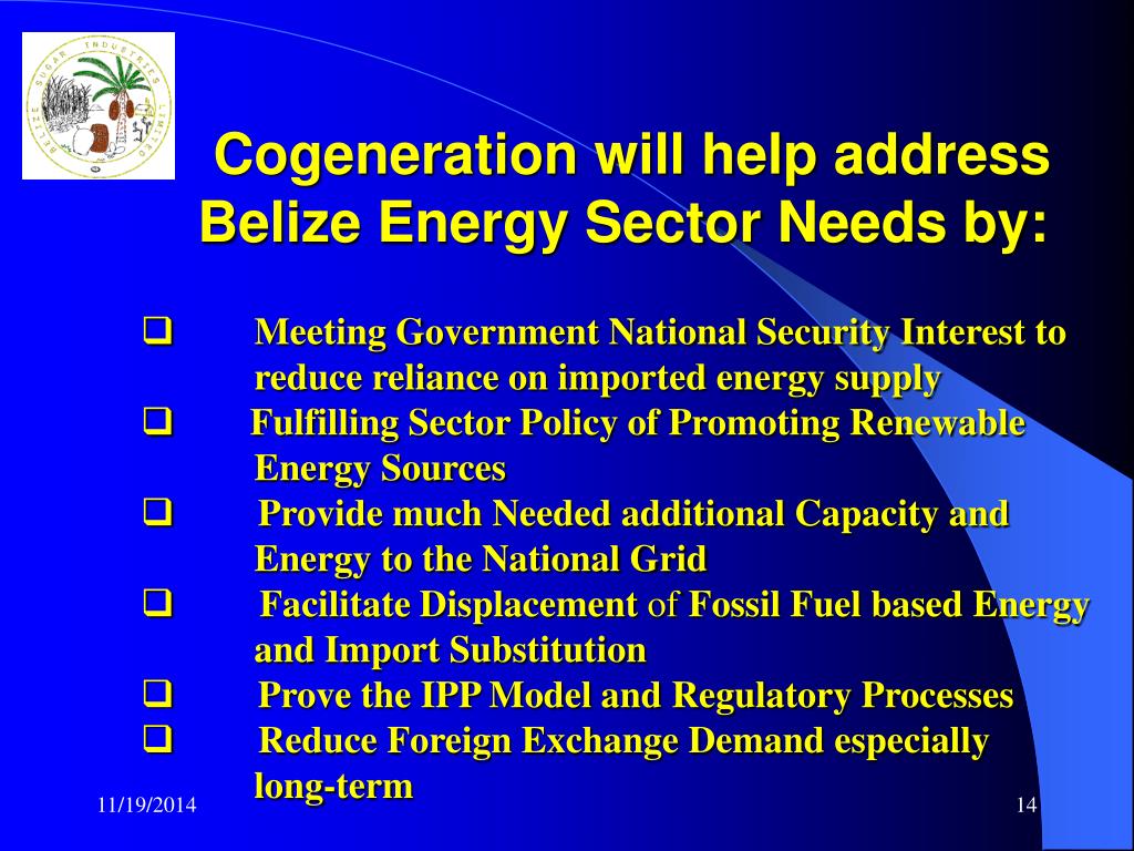 Cogeneration will help address Belize Energy Sector Needs by: • Meeting Government National Security Interest to reduce reliance on imported energy supply • Fulfilling Sector Policy of Promoting Renewable Energy Sources • Provide much Needed additional Capacity and Energy to the National Grid • Facilitate Displacementof Fossil Fuel based Energy and Import Substitution • Prove the IPP Model and Regulatory Processes • Reduce Foreign Exchange Demand especially long-term