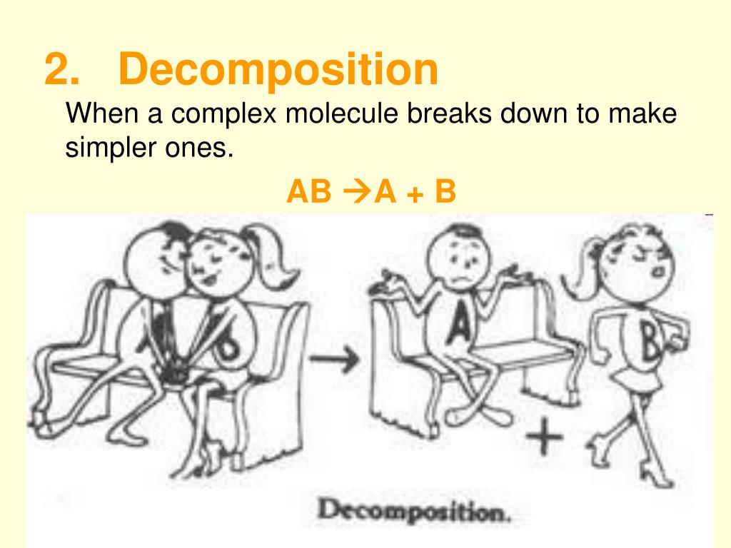 2. Decomposition When a complex molecule breaks down to make simpler ones. AB A + B