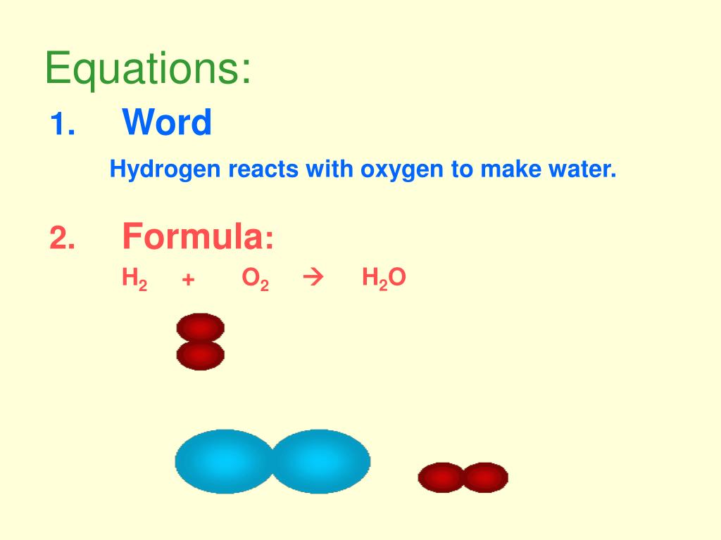 Equations: 1. Word Hydrogen reacts with oxygen to make water. 2. Formula: H2O H2 + O2