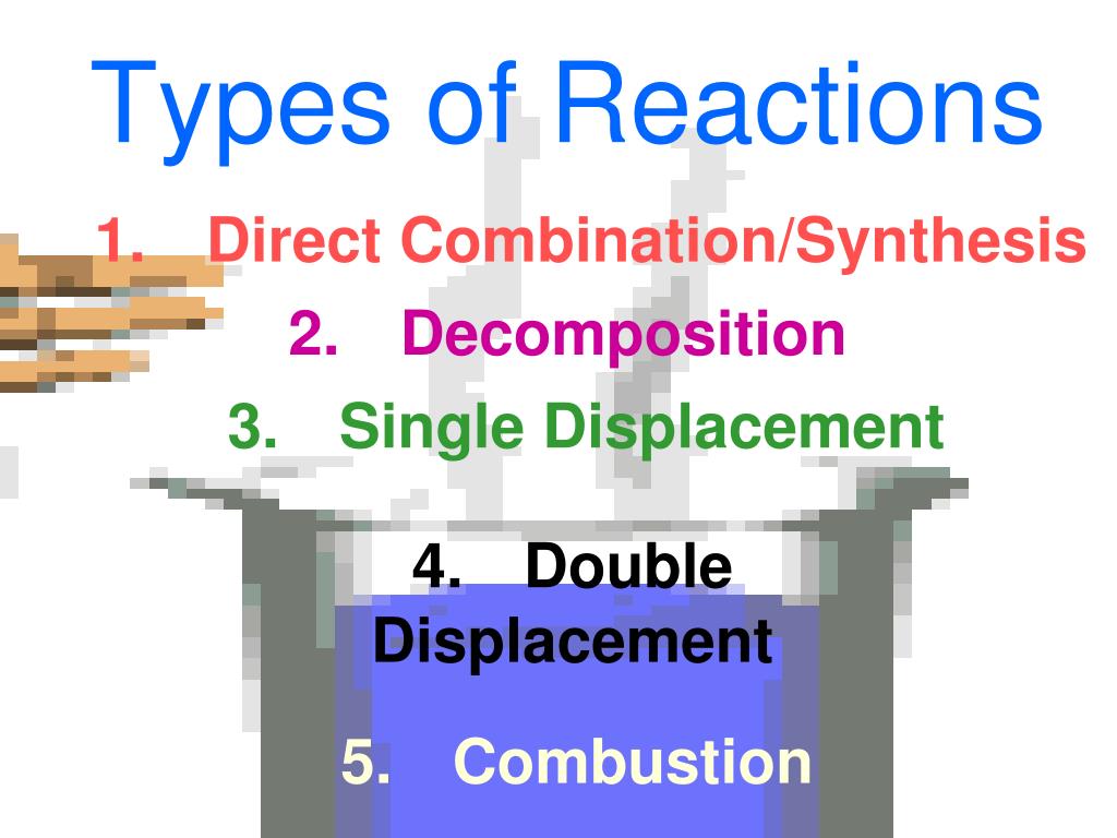 Types of Reactions 1. Direct Combination/Synthesis 2.Decomposition 3. Single Displacement 4. Double Displacement 5. Combustion