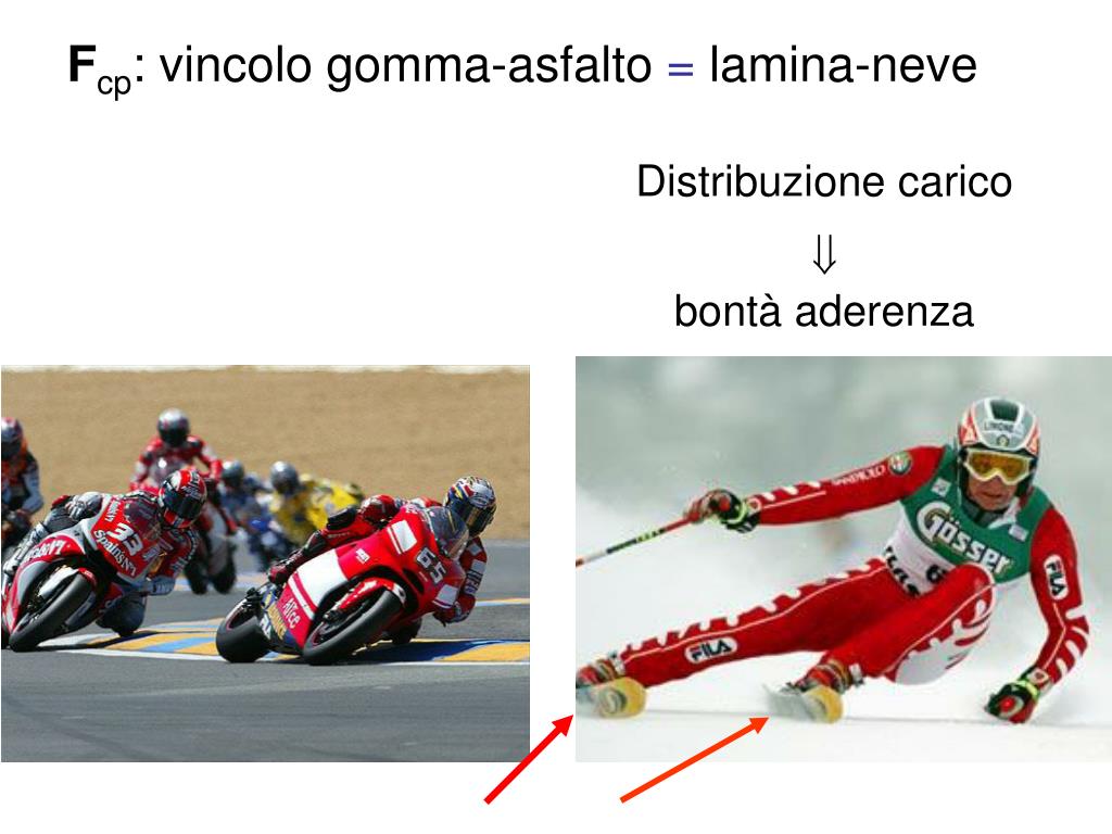 Elasticità attrezzo Flessione sci → arco (ampio) spigolo-neve N.B.: per v crescente →Φ cresce → Fcp cresce → reazione vincolo diminuisce Fcp & Fcfdominano l’equilibrio