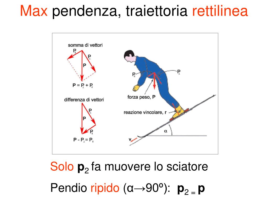 Max pendenza, traiettoria rettilinea Solop2 fa muovere lo sciatore Pendio ripido (α→90º): p2 = p