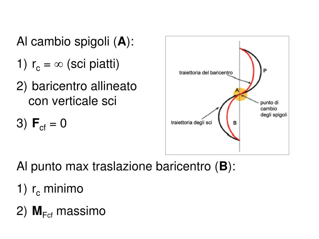 Al cambio spigoli (A): • rc = (sci piatti) • baricentro allineato con verticale sci • Fcf = 0 • Al punto max traslazione baricentro (B): • rc minimo • MFcf massimo