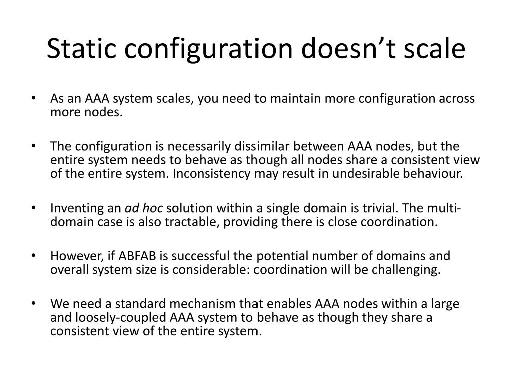 Static configuration doesn’t scale • As an AAA system scales, you need to maintain more configuration across more nodes. • The configuration is necessarily dissimilar between AAA nodes, but the entire system needs to behave as though all nodes share a consistent view of the entire system. Inconsistency may result in undesirable behaviour. • Inventing an ad hoc solution within a single domain is trivial. The multi-domain case is also tractable, providing there is close coordination. • However, if ABFAB is successful the potential number of domains and overall system size is considerable: coordination will be challenging. • We need a standard mechanism that enables AAA nodes within a large and loosely-coupled AAA system to behave as though they share a consistent view of the entire system.