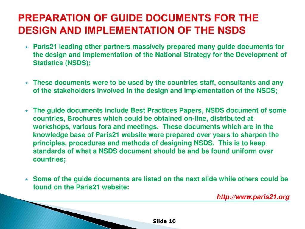 PREPARATION OF GUIDE DOCUMENTS FOR THE DESIGN AND IMPLEMENTATION OF THE NSDS • Paris21 leading other partners massively prepared many guide documents for the design and implementation of the National Strategy for the Development of Statistics (NSDS); • These documents were to be used by the countries staff, consultants and any of the stakeholders involved in the design and implementation of the NSDS; • The guide documents include Best Practices Papers, NSDS document of some countries, Brochures which could be obtained on-line, distributed at workshops, various fora and meetings. These documents which are in the knowledge base of Paris21 website were prepared over years to sharpen the principles, procedures and methods of designing NSDS. This is to keep standards of what a NSDS document should be and be found uniform over countries; • Some of the guide documents are listed on the next slide while others could be found on the Paris21 website: http://www.paris21.org