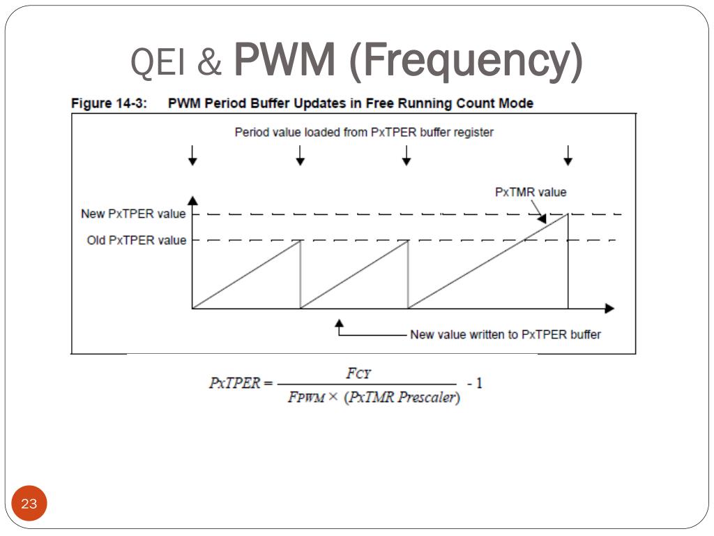 QEI & PWM • QEI stands for Quadrature Encoder Interface. In general, almost all of the encoders have two pins which generate A & B signals and as shown in Fig 3, signal A and B intersects consistently and this pattern is converted from the analog signal to digital signal by the QEI function in PIC chip. • There are four registers in QEI function, which are shown below: • Control/Status Register (QEIxCON) • Digital Filter Control Register (DFLTxCON) • Position Count Register (POSxCNT) • Maximum Count Register (MAXxCNT) • ※ ‘x’ is the number of a channel or a register.