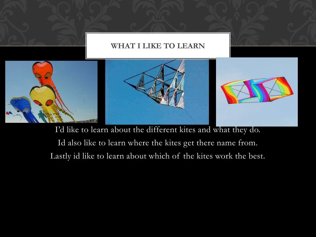 What I like to learn • I’d like to learn about the different kites and what they do. • Id also like to learn where the kites get there name from. • Lastly id like to learn about which of the kites work the best.