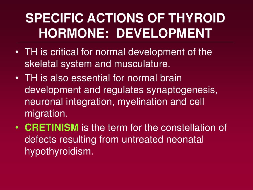 SPECIFIC ACTIONS OF THYROID HORMONE: DEVELOPMENT • TH is critical for normal development of the skeletal system and musculature. • TH is also essential for normal brain development and regulates synaptogenesis, neuronal integration, myelination and cell migration. • CRETINISM is the term for the constellation of defects resulting from untreated neonatal hypothyroidism.