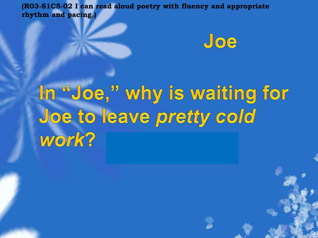 (R03-S1C5-02 I can read aloud poetry with fluency and appropriate rhythm and pacing.) Joe In “Joe,” why is waiting for Joe to leave pretty cold work? The birds have to wait in the cold until Joe finishes his meal before they can eat.
