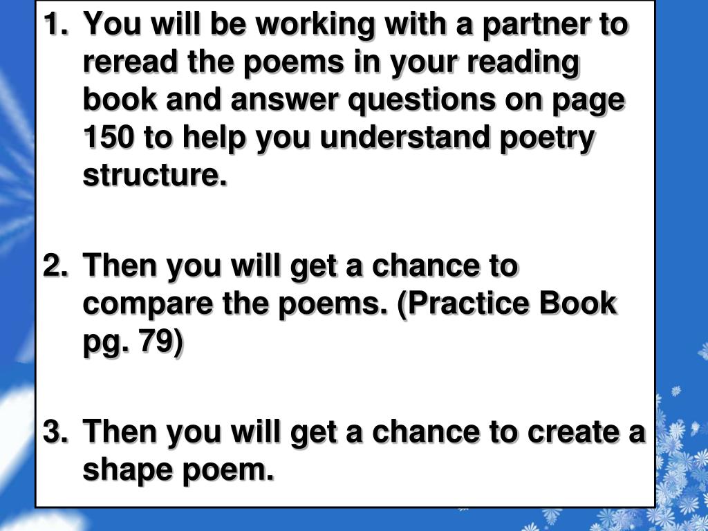 You will be working with a partner to reread the poems in your reading book and answer questions on page 150 to help you understand poetry structure. • Then you will get a chance to compare the poems. (Practice Book pg. 79) • Then you will get a chance to create a shape poem.