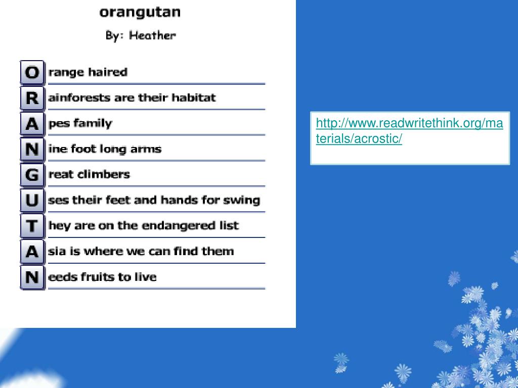 Acrostic Poems Using each letter of your name of the animal create a poem. Happy when with her students Excellent cook Appreciates honesty Teaches young people Healthy eating is the way Energetic personality Reads all kinds of stories