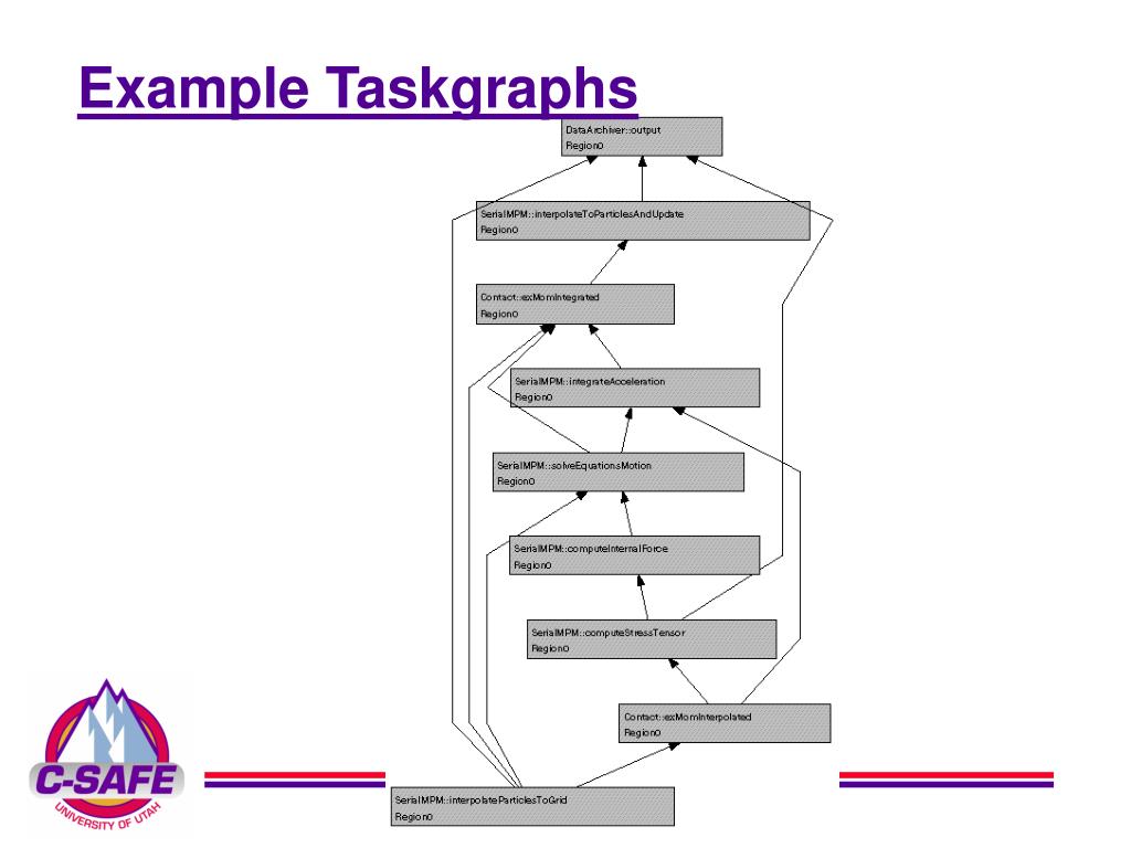 Taskgraph advantages • Can accommodate flexible integration needs • Can accommodate a wide range of unforeseen work loads • Can accommodate a mix of static and dynamic load balance • Helps manage complexity of a mixed threads/MPI programming model • Allows pieces (including the scheduler) to evolve independently