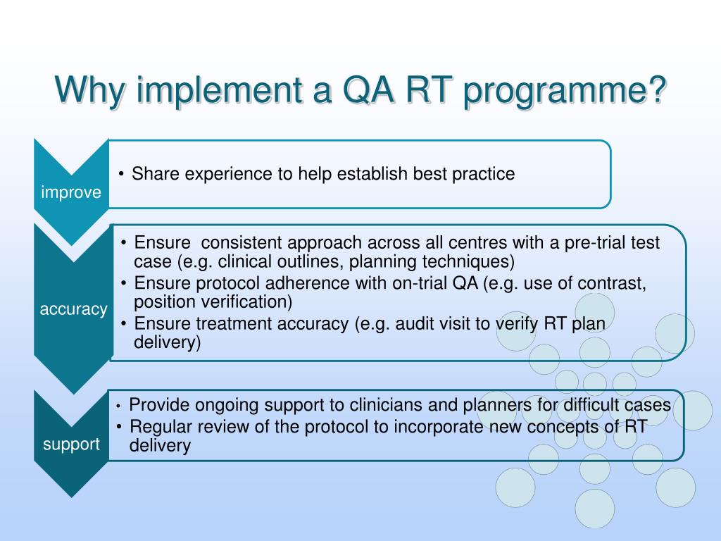 Pros and Cons Pros Cons Pre-trial can take time complete and lengthen set up times May put centres off taking part Can be time consuming chasing up data Additional resources needed to evaluate plans • Ensures the quality of data • Provides data on consistency of dose and treatment • Assesses adherence to protocol • Educational component ensures minimum standard of treatment planning • Helps improve networking and relationship with sites