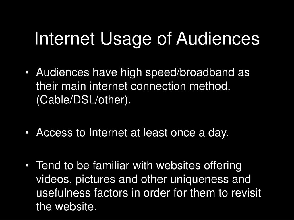 Internet Usage of Audiences • Audiences have high speed/broadband as their main internet connection method. (Cable/DSL/other). • Access to Internet at least once a day. • Tend to be familiar with websites offering videos, pictures and other uniqueness and usefulness factors in order for them to revisit the website.