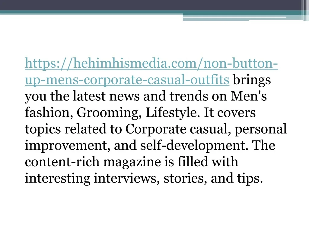 https://hehimhismedia.com/non-button-up-mens-corporate-casual-outfitsbrings you the latest news and trends on Men's fashion, Grooming, Lifestyle. It covers topics related to Corporate casual, personal improvement, and self-development. The content-rich magazine is filled with interesting interviews, stories, and tips.