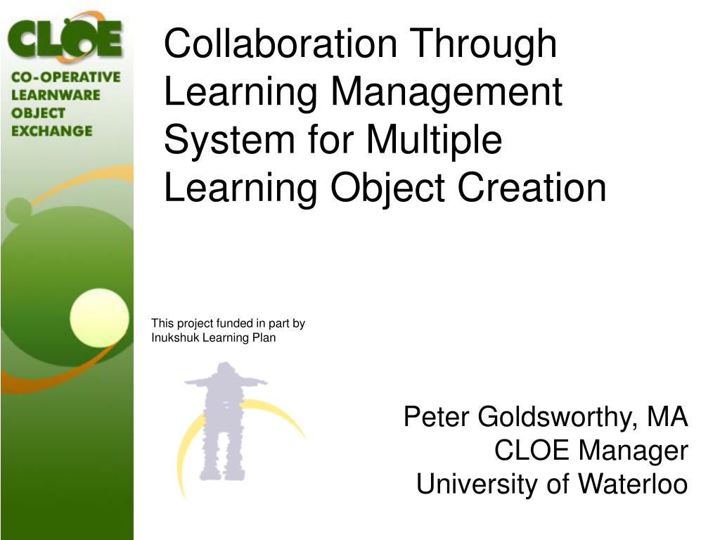 Collaboration Through Learning Management System for Multiple Learning Object Creation Peter Goldsworthy, MA CLOE Manager University of Waterloo This project funded in part by Inukshuk Learning Plan