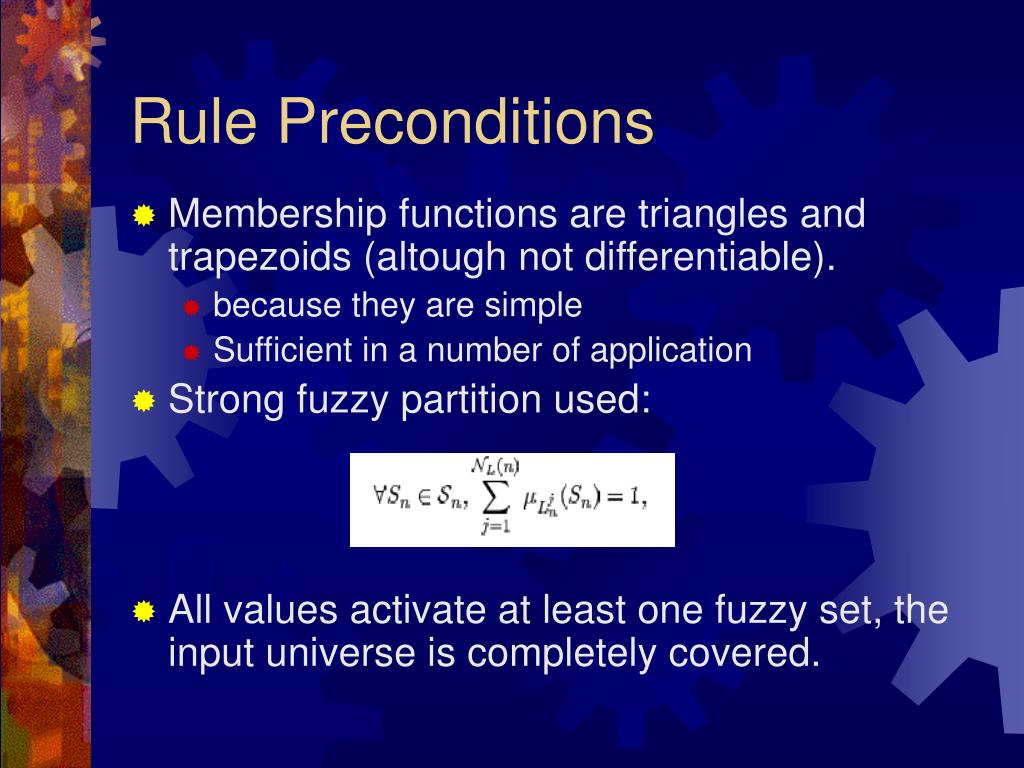 Rule Preconditions • Membership functions are triangles and trapezoids (altough not differentiable). • because they are simple • Sufficient in a number of application • Strong fuzzy partition used: • All values activate at least one fuzzy set, the input universe is completely covered.