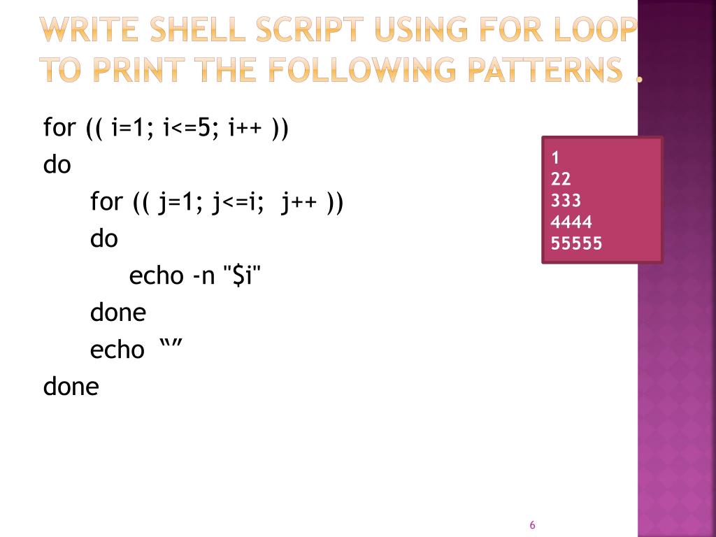 Write shell script using for loop to print the following patterns . 122333444455555 for (( i=1; i<=5; i++ )) do for (( j=1; j<=i; j++ )) do echo -n "$i" done echo ”“ done