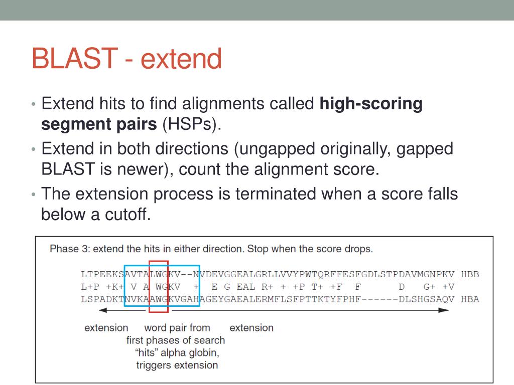 BLAST - extend • Extend hits to find alignments called high-scoring segment pairs (HSPs). • Extend in both directions (ungapped originally, gapped BLAST is newer), count the alignment score. • The extension process is terminated when a score falls below a cutoff.