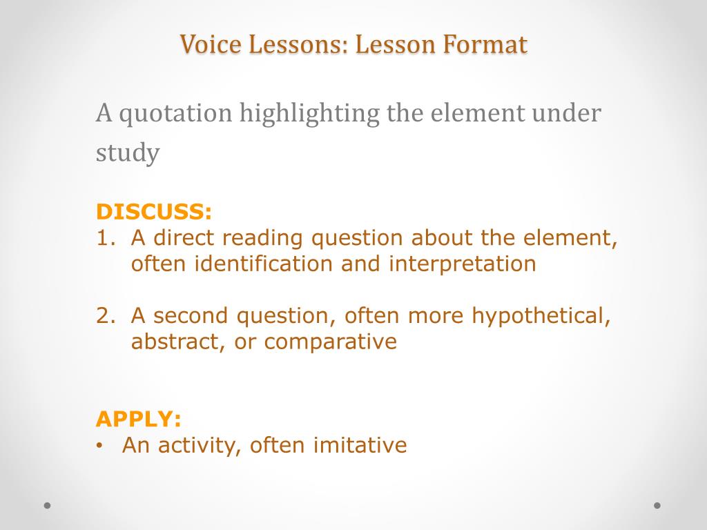 Voice Lessons: Lesson Format A quotation highlighting the element under study DISCUSS: • A direct reading question about the element, often identification and interpretation • A second question, often more hypothetical, abstract, or comparative APPLY: • An activity, often imitative