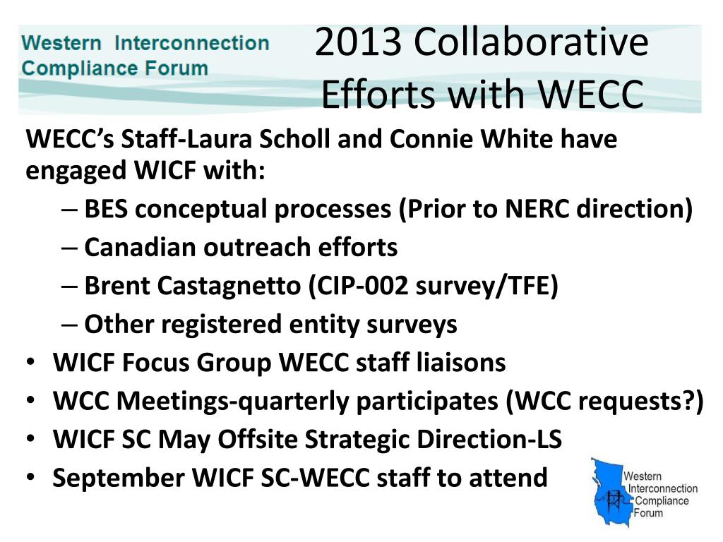 2013 Collaborative Efforts with WECC WECC’s Staff-Laura Scholl and Connie White have engaged WICF with: BES conceptual processes (Prior to NERC direction) Canadian outreach efforts Brent Castagnetto (CIP-002 survey/TFE) Other registered entity surveys WICF Focus Group WECC staff liaisons WCC Meetings-quarterly participates (WCC requests?) WICF SC May Offsite Strategic Direction-LS September WICF SC-WECC staff to attend